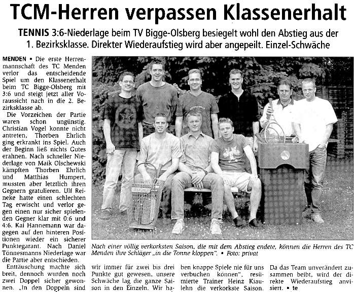 Wir starteten deshalb voller Elan in die neue Spielzeit, und es fing zumindest auch mal ganz gut an: Den SWL-Absteiger TC Plettenberg konnten wir kompromißlos zurück in die Heimat schicken, und mit dem 9:0 im Rücken auch ganz getrost die weitere Saison abwarten. Beim folgenden Vergleich mit dem Hagener TC BG jedoch blieben wir wohl alle hinter den gesteckten Erwartungen zurück, und es setzte sogleich die erste Saisonniederlage. Der anschließende Besuch beim stark aufspielenden TC Milstenau verbesserte die Stimmung auch nicht wirklich, da uns auch diesmal der erhoffte Auswärtserfolg versagt blieb. Gegen die bereits bekannten Spieler des TC Halden 2000 reichte es vor heimischen Publikum zwar noch zu einer soliden Einzelleistung, bei den Doppeln ging uns dann aber viel zu schnell die Puste aus: Das 3:6 bedeutete bereits die dritte Niederlage dieser Spielzeit in Folge! Von wegen Aufstieg, von jetzt an waren wir klar in den Kampf gegen den Abstieg verwickelt! Die folgende Begegnung gegen das noch unbekannte Team der SG Demag-Wetter wendete diese Spielzeit aber schließlich doch noch zum Guten: Einer geschlossenen Mannschaftsleistung auf fremder Anlage folgte ein klarer 7:2 Sieg, an dem auch Oldie Frank Schwermer seinen nennenswerten Anteil hatte. Letzte Zweifel über den Klassenverbleib beseitigte unser Heimerfolg gegen den TC Menden, der bereits schon nach den Einzelergebnissen feststand. Gegen die bereits als Absteiger feststehenden Herdringer setzte es abschließend am Tag des WM - Endpiels 2002 noch eine Niederlage, die aber niemanden mehr schmerzte.