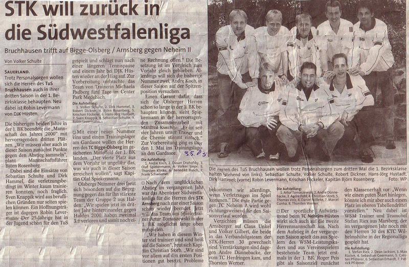 in die Saison. André Koch agierte in diesem Jahr als neuer Spitzenspieler, während sich Dusan auf Position 2 behaupten würde. Diese Taktik fruchtete sogleich, da wir den Erndtebrückern auf fast allen Positionen den entscheidenden Tick überlegen waren - ein hochklassiges Spiel endete verdient mit 6:3 für uns! Mit neuem Selbstvertrauen ausgerüstet, widmeten wir uns nun dem anstehenden Derby gegen den TuS Bruchhausen, der in diesem Jahr gegen den Abstieg kämpfte. Der deutliche 8:1 Heimerfolg war dabei trotz einiger Dreisatzentscheidungen nie gefährdet.