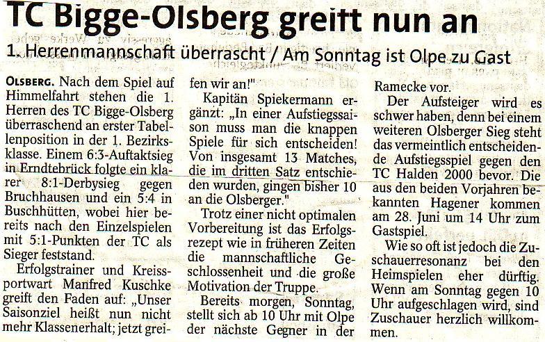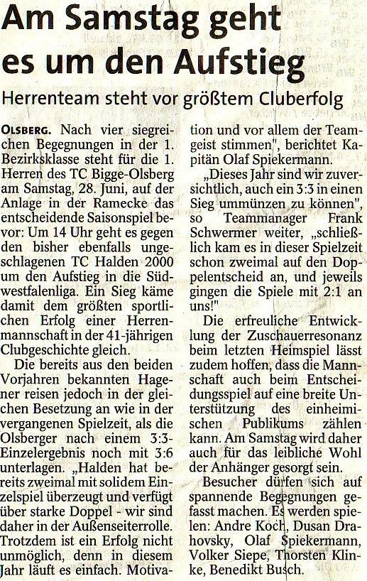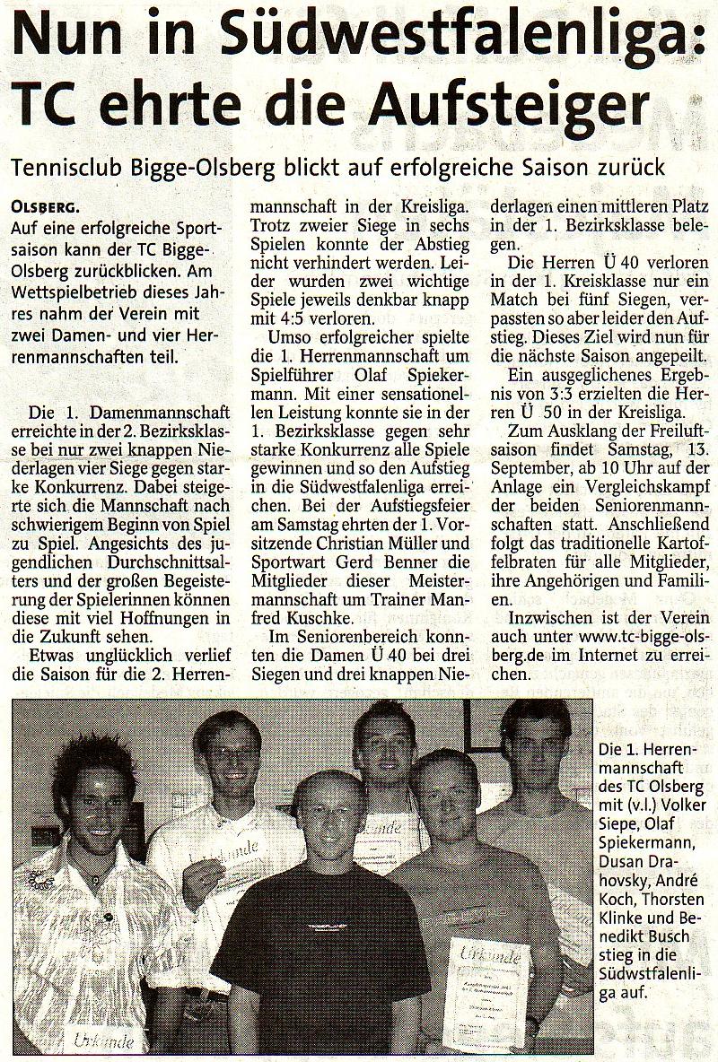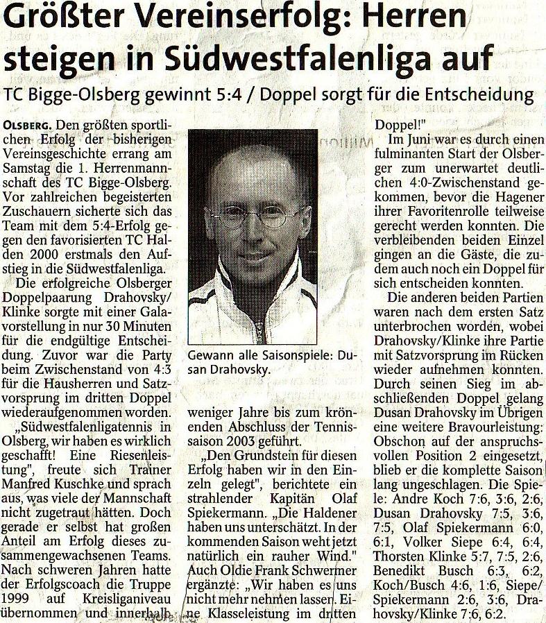 Beim Showdown etwa vier Wochen später konnten wir dann zum zweiten Mal nach 1996 in Ennepetal etwa 40 Zuschauer bei einem Tennisspiel begrüßen: Bei bestem Tenniswetter ging es erneut um den Aufstieg in die SWL! Keiner der Anwesenden hat sein Kommen bereut, denn die Leistung unseres dritten Doppels glich an diesem Tag einer wirklichen Galavorstellung: Mit Zaubertennis und Traumschlägen sicherte ein überragender 6:2 Satzerfolg den erstmaligen Aufstieg eines Olsberger Herrenteams in die Südwestfalenliga! Der größte Erfolg der Vereinsgeschichte war Wirklichkeit geworden und wurde im Anschluß von allen Anwesenden gebührend gefeiert!